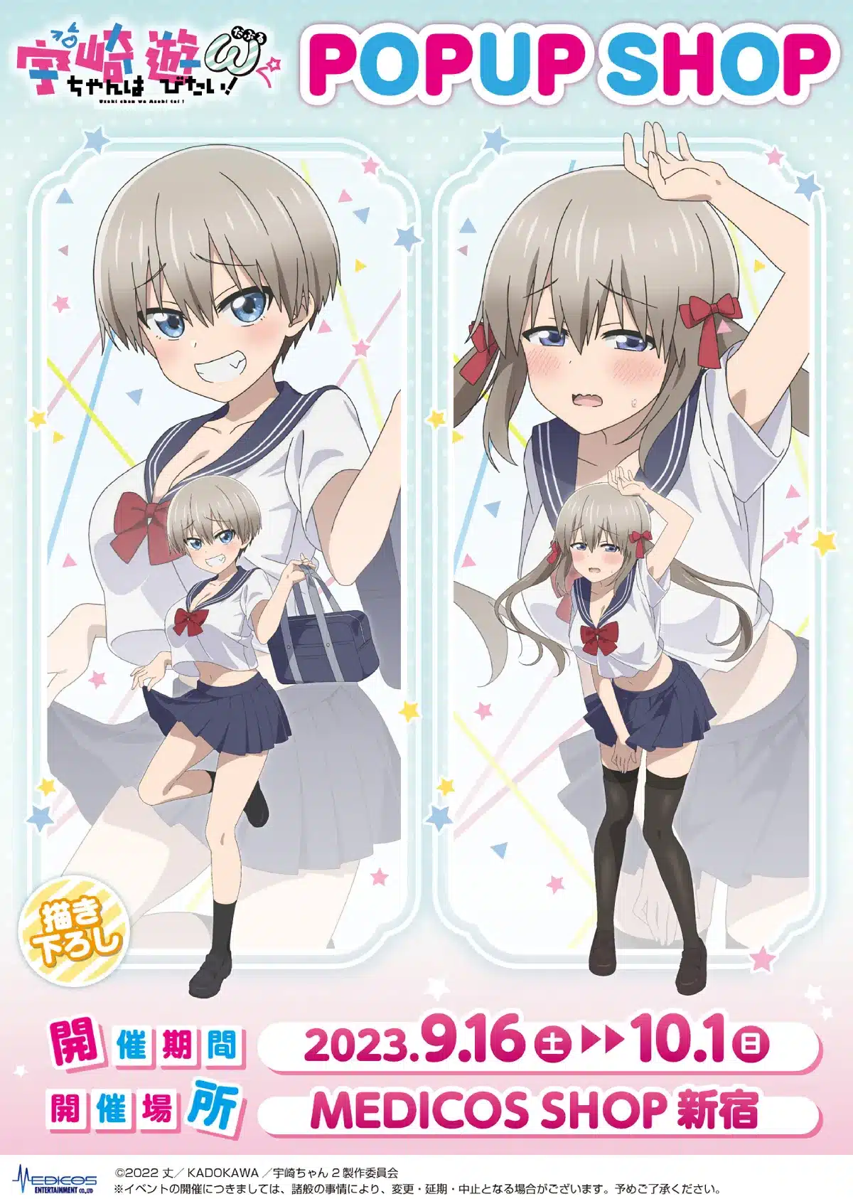 Esta maravillosa colaboraciรณn entre el anime ยซUzaki-chan wa Asobitai!ยป y la compaรฑรญa Medicos Entertainment estรก programada para llevarse a cabo en Japรณn a partir del 16 de septiembre hasta el 1 de octubre de este aรฑo. Consistirรก en la producciรณn de increรญbles productos inspirados en las waifus Hana Uzaki y Tsuki Uzaki.