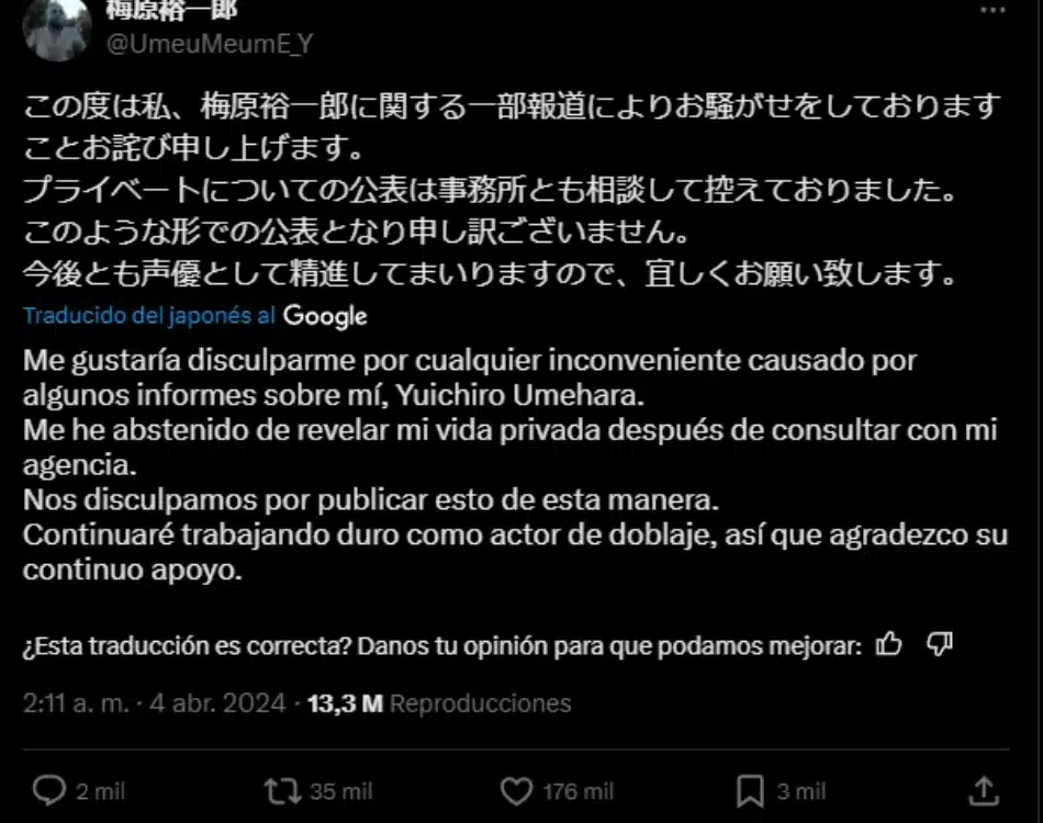 Luego de esto se confirmó lo siguiente en los medios: “La verdadera identidad de este apuesto caballero era Yuichiro Umehara, un actor de voz. Aunque es alguien muy popular, parece que se casó en secreto hace varios años. Nunca lo anunció públicamente, así que es posible que sus fanáticas le lloren ríos ahora que se ha revelado de esta forma”.