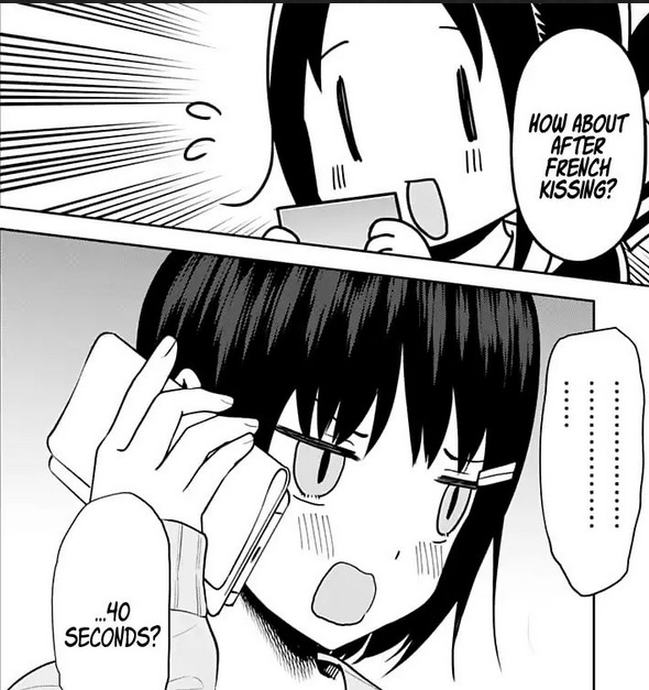 Hayasaka nuevamente le explica a Kaguya que el beso francés solo se da cuando la pareja está decidida a tener relaciones sexuales, Kaguya incrédula decide llamar a una «experta» Nagisa quien fue la que le dio esos consejos, es ahí donde le menciona que solo pasaron 40 segundos después del beso francés para que tuviera relaciones con su novio.