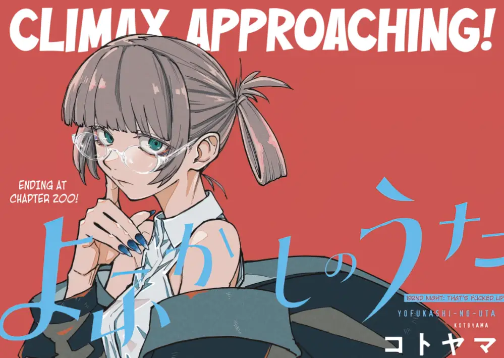 Recordemos que hasta la fecha Call of the Night ha publicado alrededor de 192 capitulos del manga e incluso en el ultimo capitulo publicado hay una pagina a color en donde da a conocer a los espectadores que el manga esta muy proximo a terminar en el capitulo 200 y es que la historia poco a poco fue desarrollandose para llegar hasta donde se esta hoy en la historia y para darle el merecido final que la historia merece despues de mucho tiempo.